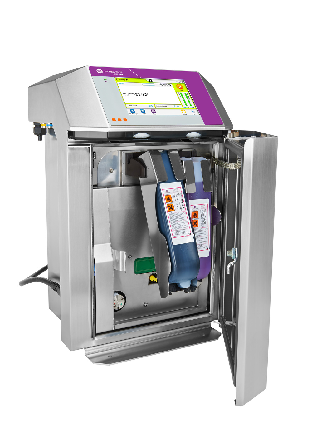 9450 maksymalizuje wydajność produkcji dzięki wiodącemu w branży wskaźnikowi dostępności. Innowacyjny system kartridży Intelli’Inks® sprawia, że uruchomienia są czyste i automatyczne, maksymalizując czas pracy bez przestojów. 9450 Markem-Imaje drukuje kody wysokiej rozdzielczości 20% szybciej niż podobne drukarki, a promocyjne kodowanie wykonać można po prostu korzystając z pendrive. Dzięki największemu portfolio atramentów na rynku, 9450 Markem-Imaje tworzy wysokiej jakości znakowanie nawet na najtrudniejszych podłożach.