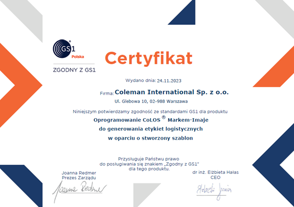 Z dumą informujemy, że produkt CoLOS® Markem-Imaje przeszedł pozytywnie proces weryfikacji zgodności ze standardami GS1 w zakresie generowania etykiety logistycznej i uzyskał certyfikat „Zgodny z GS1”.